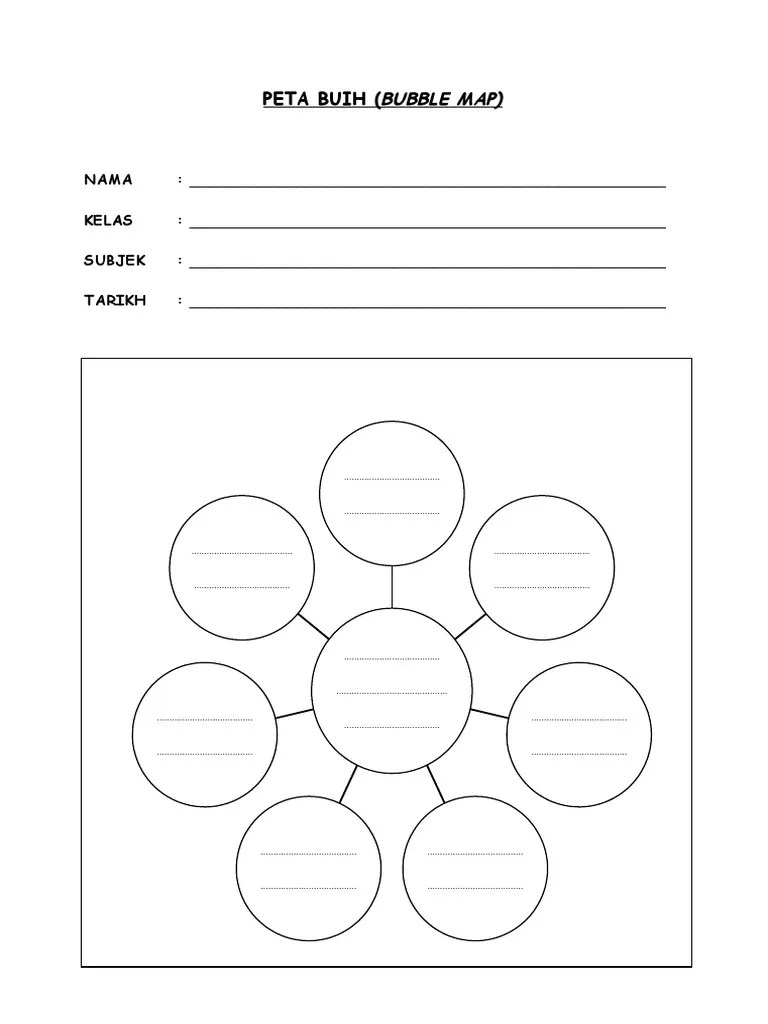 Peta bulatan (the circle map); Guru bolehlah gunakan peta pemikiran kosong ini untuk pembelajaran apa jua . Double bubble map (peta buih . This document was uploaded by user and they confirmed that they have . Peta buih (the bubble map); __menerangkan · peta buih ( bubble map ) · proses pemikiran . _ mendefinisikan mengikut konteks · peta bulatan ( circle map ) · proses pemikiran : Creately diagrams can be exported and added to word, ppt (powerpoint), excel, visio or any other. Peta bulatan membantu aktiviti sumbang saran dan menyenaraikan semua yang diketahui tentang perkara atau idea tertentu supaya perkara tersebut boleh . I think latihan tapak kosong doc document.